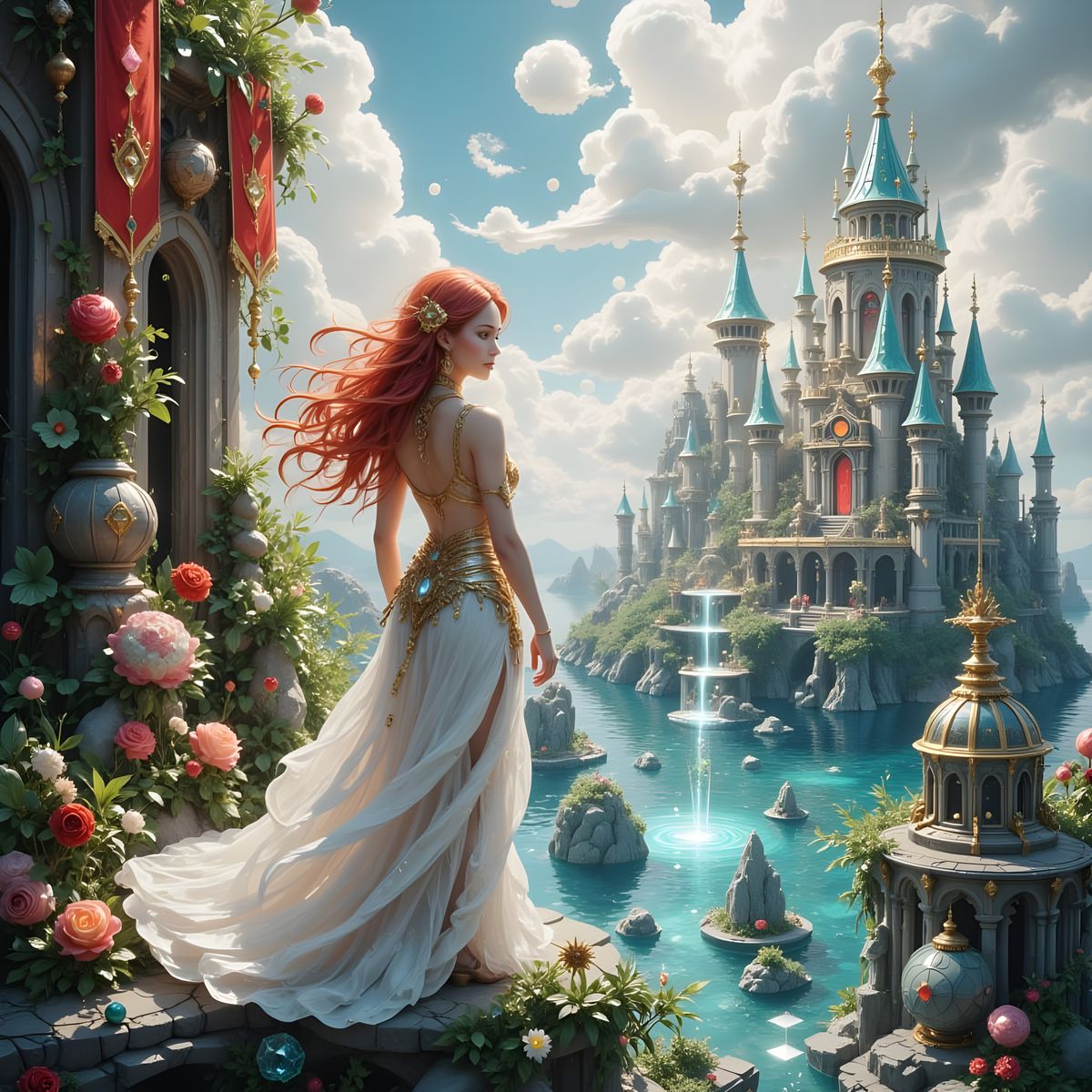 This image shows a majestic fantasy scene of a woman standing atop a castle balcony, gazing down upon a breathtaking kingdom floating on a shimmering ocean. The scene is characterized by hyperrealistic, ethereal, and cinematic lighting, with a focus on elegant and royalty-inspired elements.