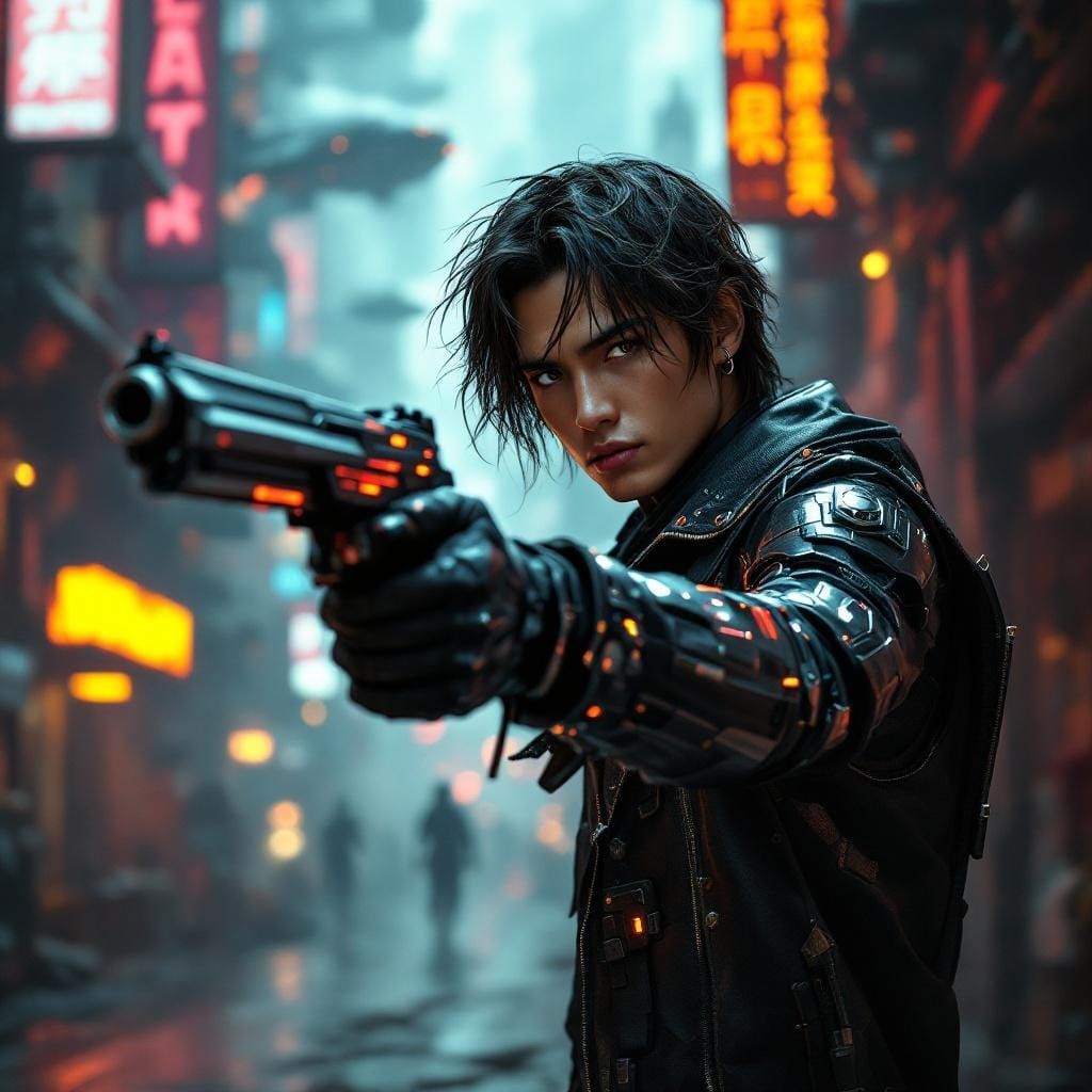 A vivid image of a young, handsome space cowboy in a gritty, neon-lit spaceport. He holds a blaster, his youthful face reflecting intensity amid the chaotic backdrop, presented as space opera drama.