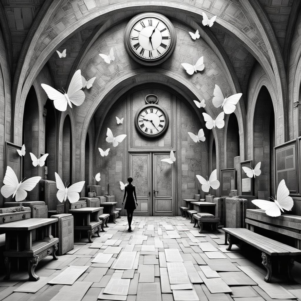 This image showcases a black and white train station, meticulously crafted from paper. Paper butterflies and textual patterns evoke a jazz-inspired atmosphere, like a whispered jazz night.