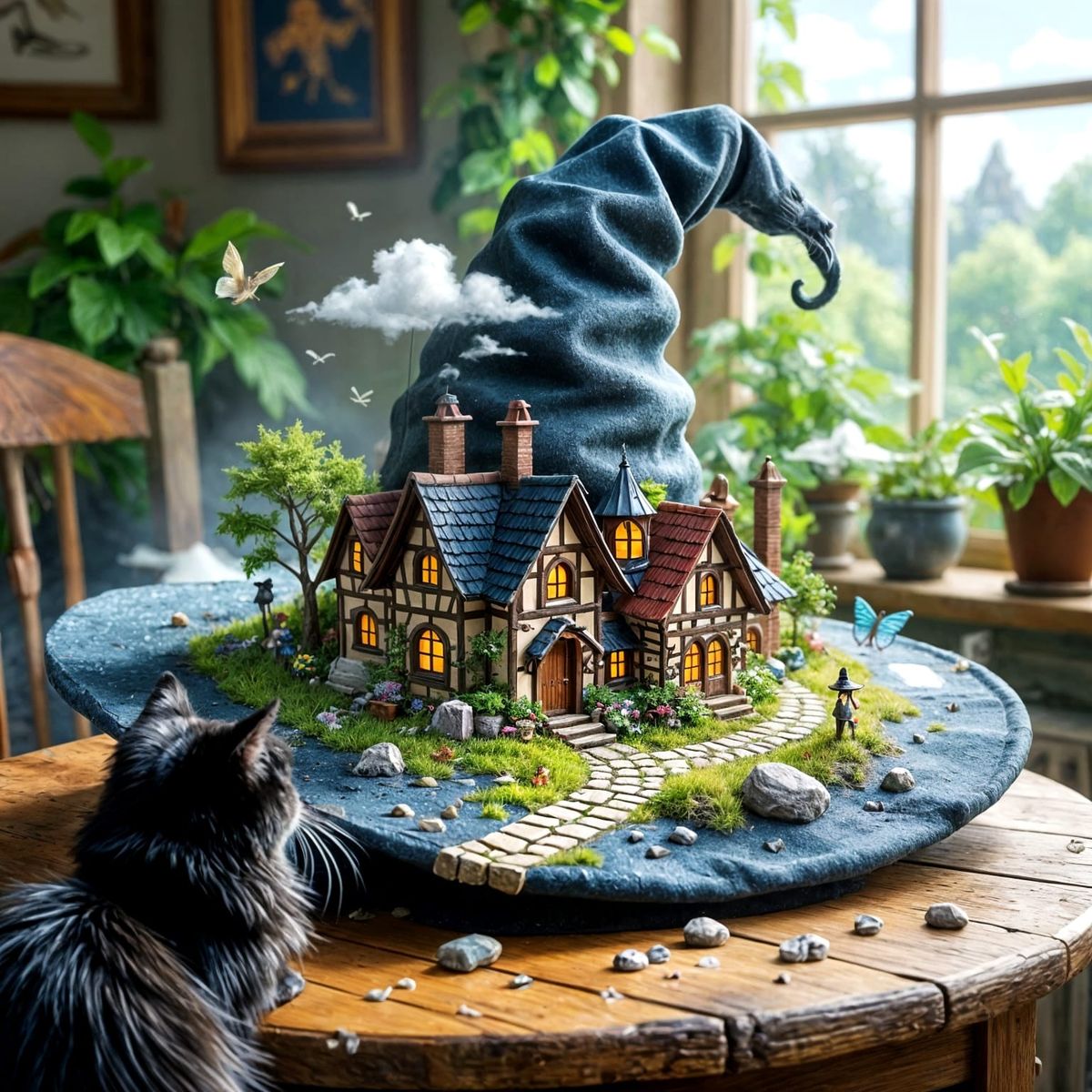 This image shows a witch's hat on a table, upon which a miniature magical world has formed. A tiny fairytale town bustles with life under rocks and clouds, while a curious black cat observes.