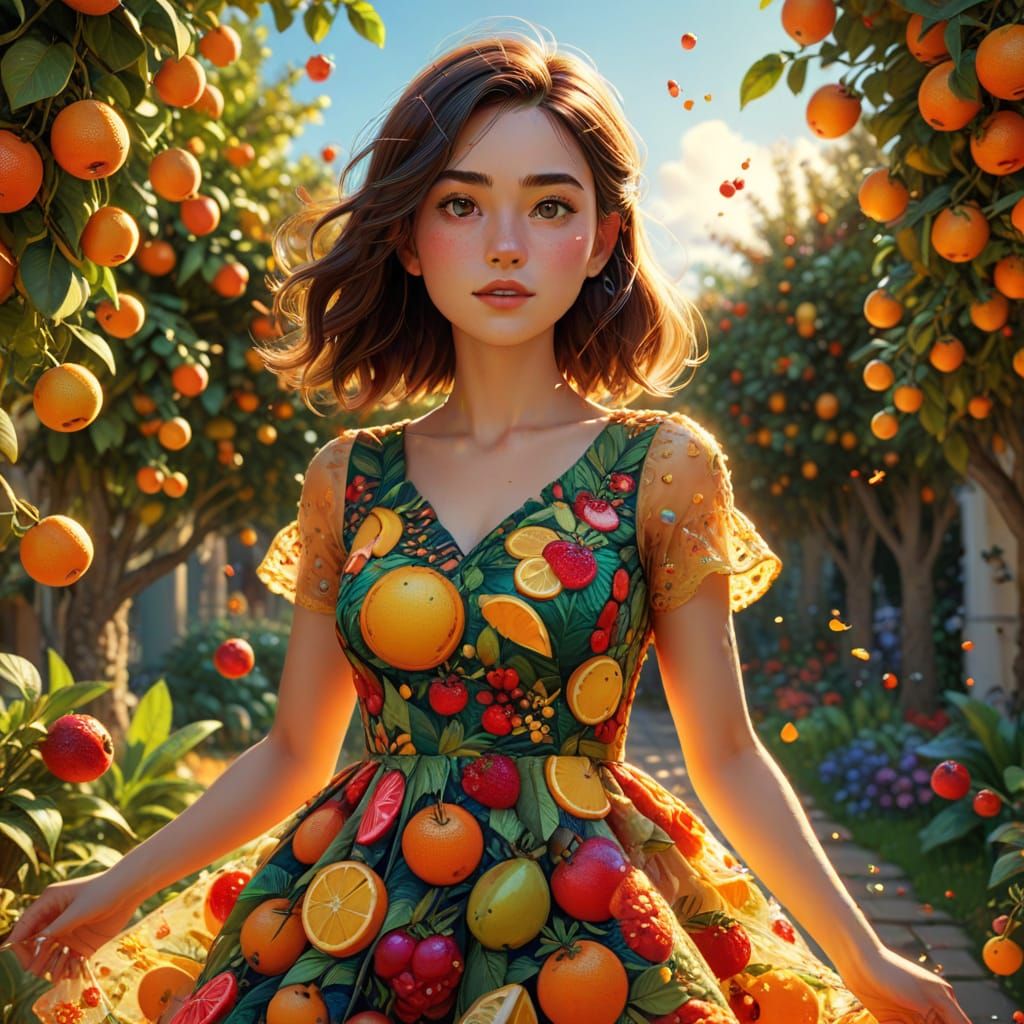 This image shows a girl in a vibrant, fruit-themed dress. The digital art, reminiscent of Pixar animation, features colorful embroidery and a blooming garden backdrop, all bathed in warm sunlight.