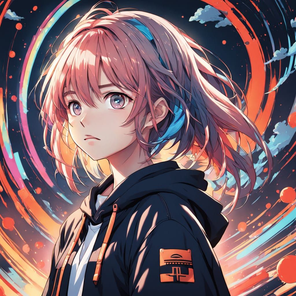 This anime key visual features a shy adolescent girl with brightly dyed hair and multi-colored eyes, bathed in soft, ethereal lighting, showcasing high detail and vibrant colors.