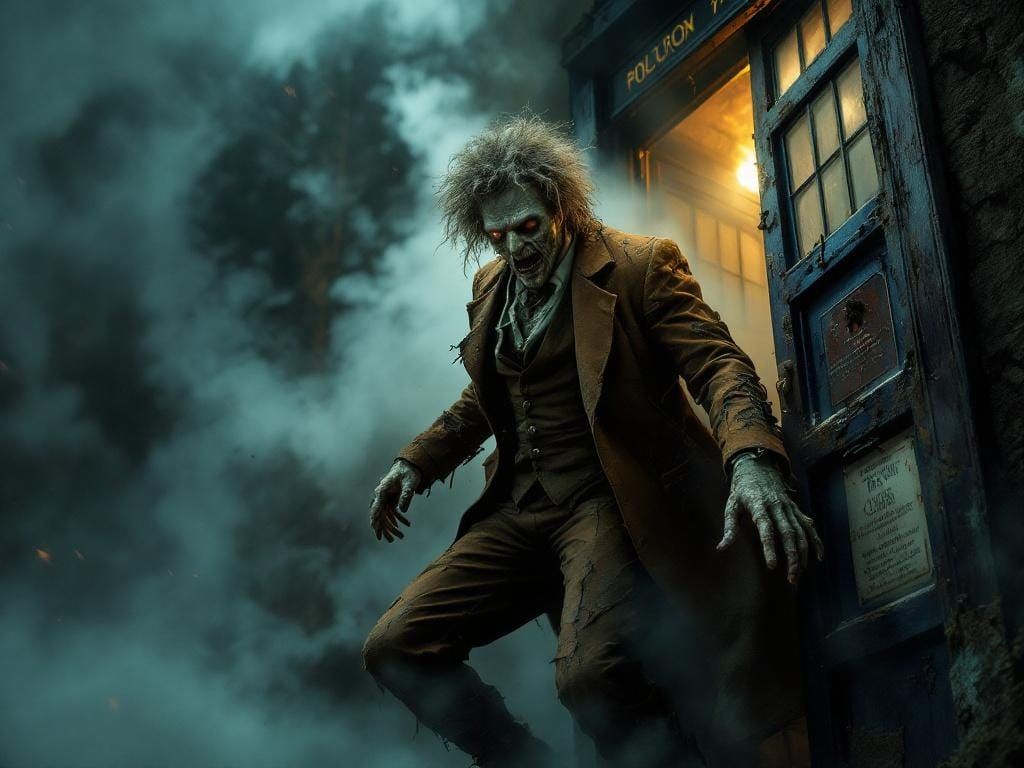A hyperrealistic image of a zombie resembling the Fourth Doctor emerging from the TARDIS. The scene features eerie mist, a gothic aesthetic, dramatic lighting, and deep colors.