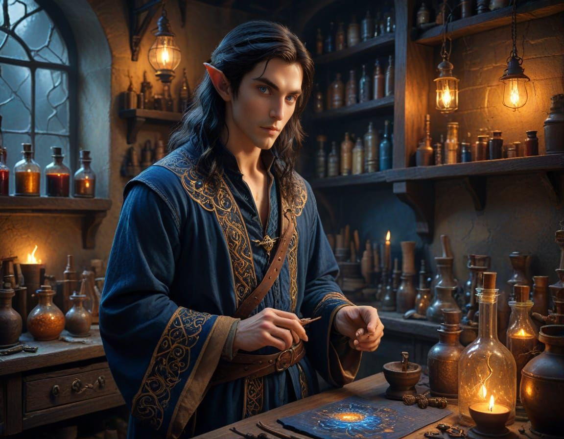 A full length portrait of a handsome, athletic, young male elf crafting potions in a medieval laboratory. He wears a midnight blue robe and black belt in a Celtic style.