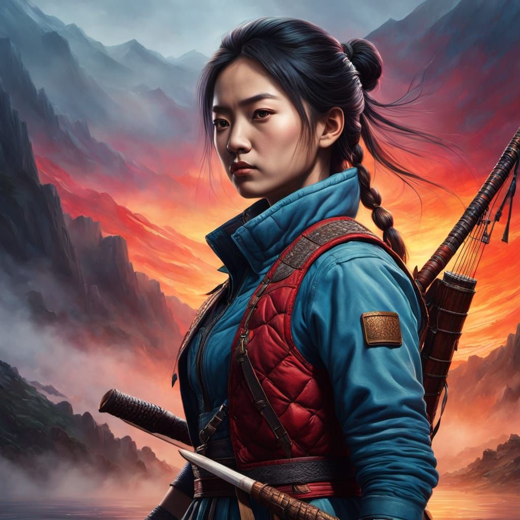 A striking picture of an Asian woman warrior holding a pike. She wears a padded vest and stands against a misty backdrop, illuminated by dramatic side lighting. The artwork is rendered with vibrant colors and intricate textures.
