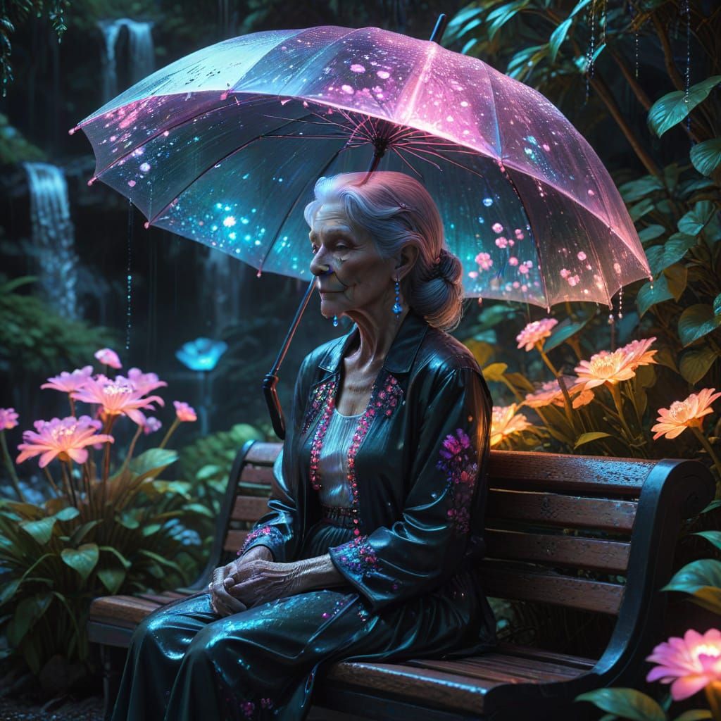 ((Closeup Photorealistic Portraits )) An Alienatic natural landscape filled with glowing jeweled flowers that dissolve into calm diamond waterfall with detailed grandma sitting on a bench with an umbrella. Neon , palette , creating a serene and otherworldly atmosphere, fluidity, dreamlike transitions, ...