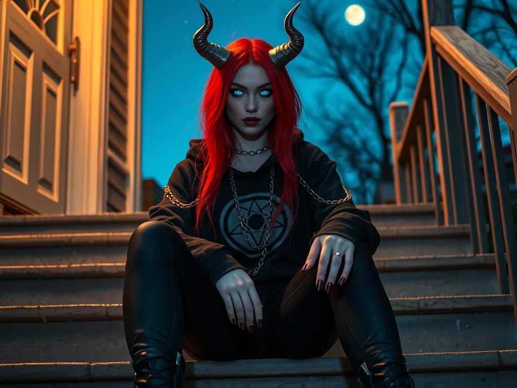 This image shows a striking demonic woman with piercing blue eyes and silver horns, sitting on her stoop at night. She is depicted in a dark fantasy style, illuminated by moonlight and starlight.