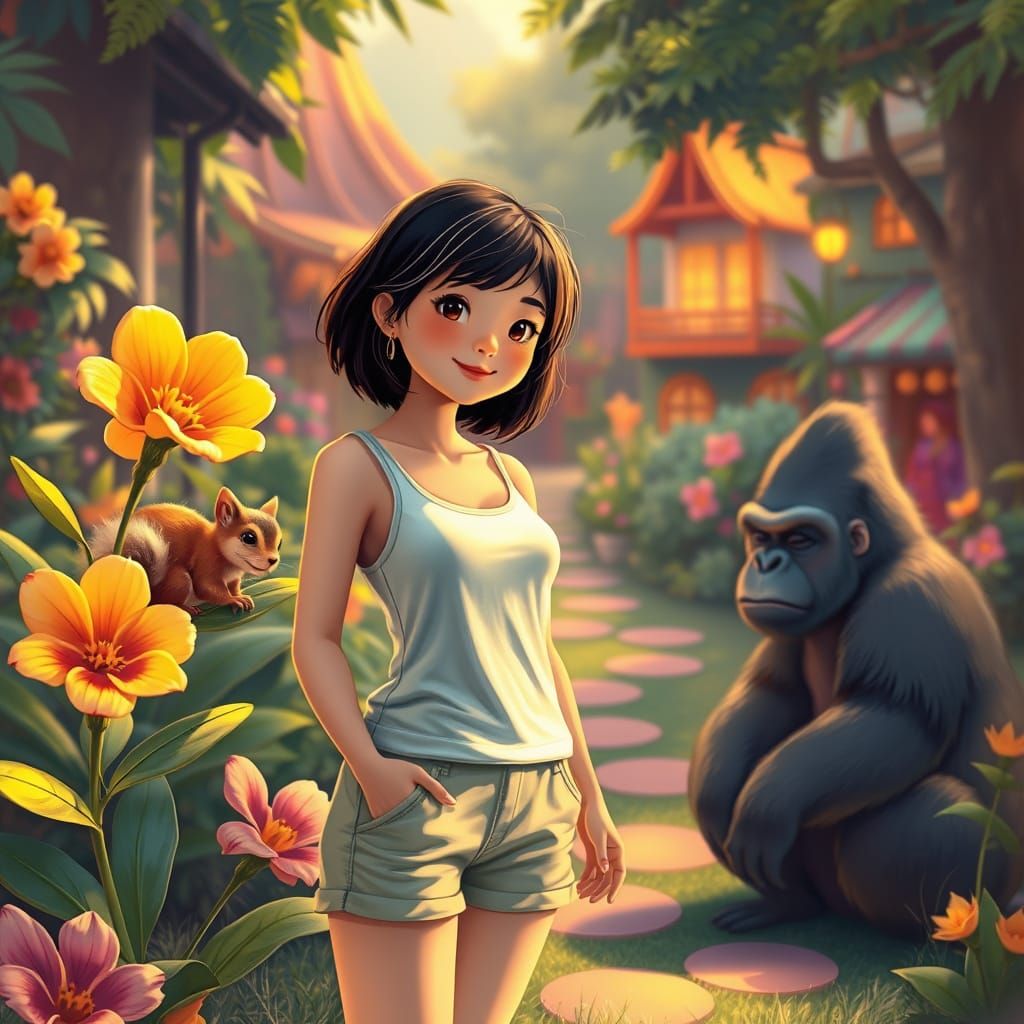 This image shows a young Asian woman in a garden city with a squirrel and gorilla. The artwork features vibrant, whimsical digital art with painterly textures and saturated colors, bathed in warm golden hour light.