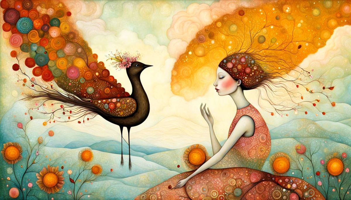This image features a detailed and intricate dreamlike woman-bird rendered in bright, delicate pastel colors. The artwork exhibits characteristics of raw, expressive art brut.