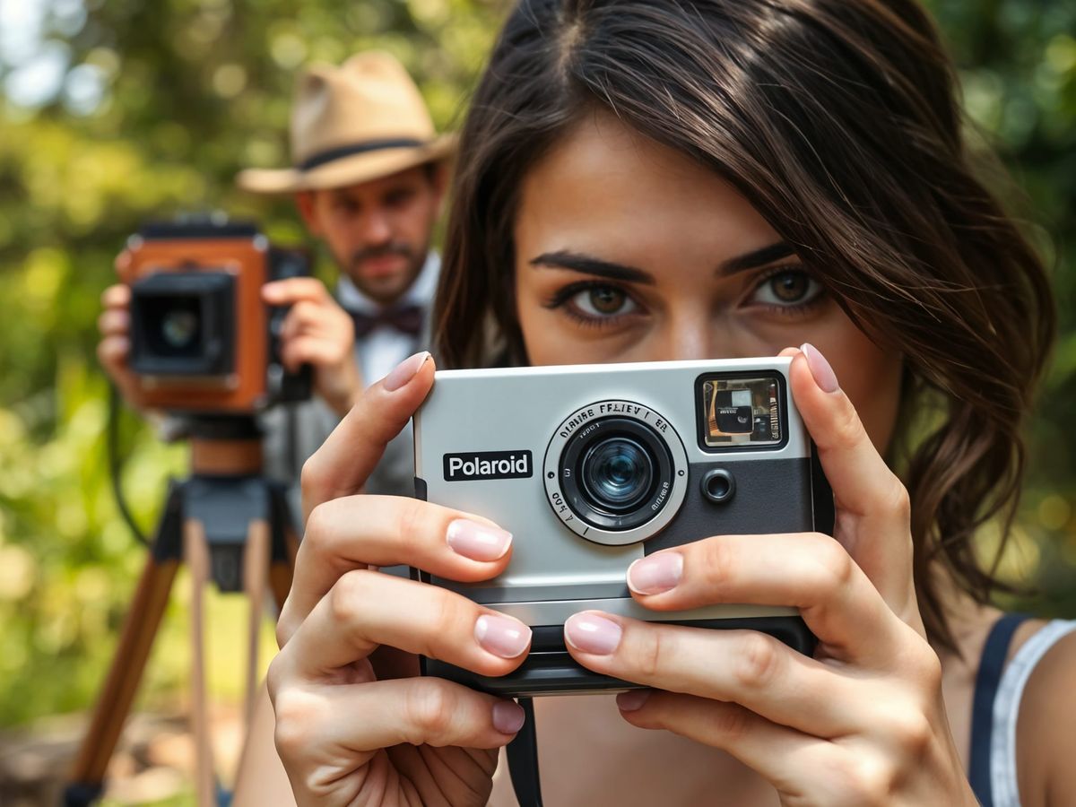 This image shows a close-up view of a young woman using a Polaroid camera. Behind her, a blurred vintage photographer poses with an antique field camera in a sunny garden. The image has a professional photography aesthetic.