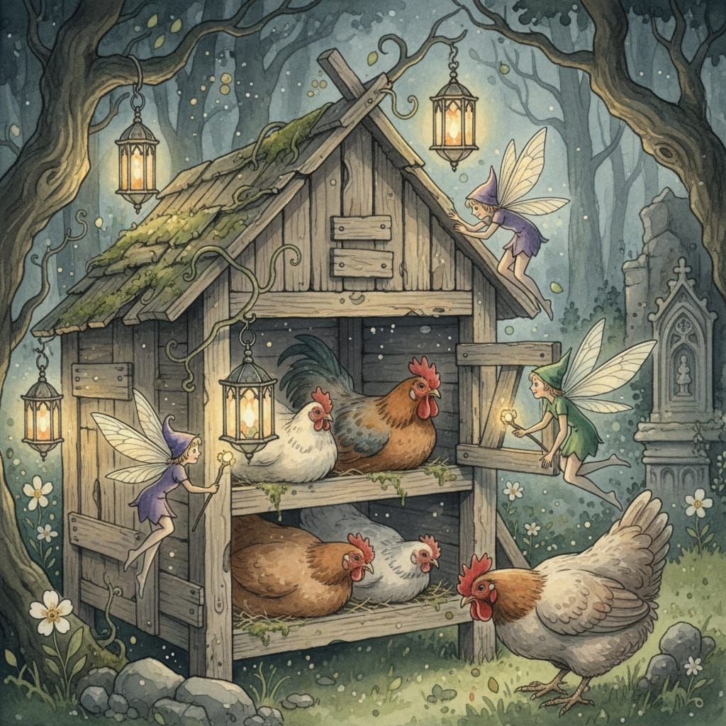 Whimsical pixies with delicate, translucent wings flutter around a rustic chicken coop, their tiny forms illuminated by the soft glow of scattered lanterns. The scene is painted with the gentle, flowing strokes of watercolor, with soft edges and a dreamlike atmosphere. The colors are muted yet vibrant, ...