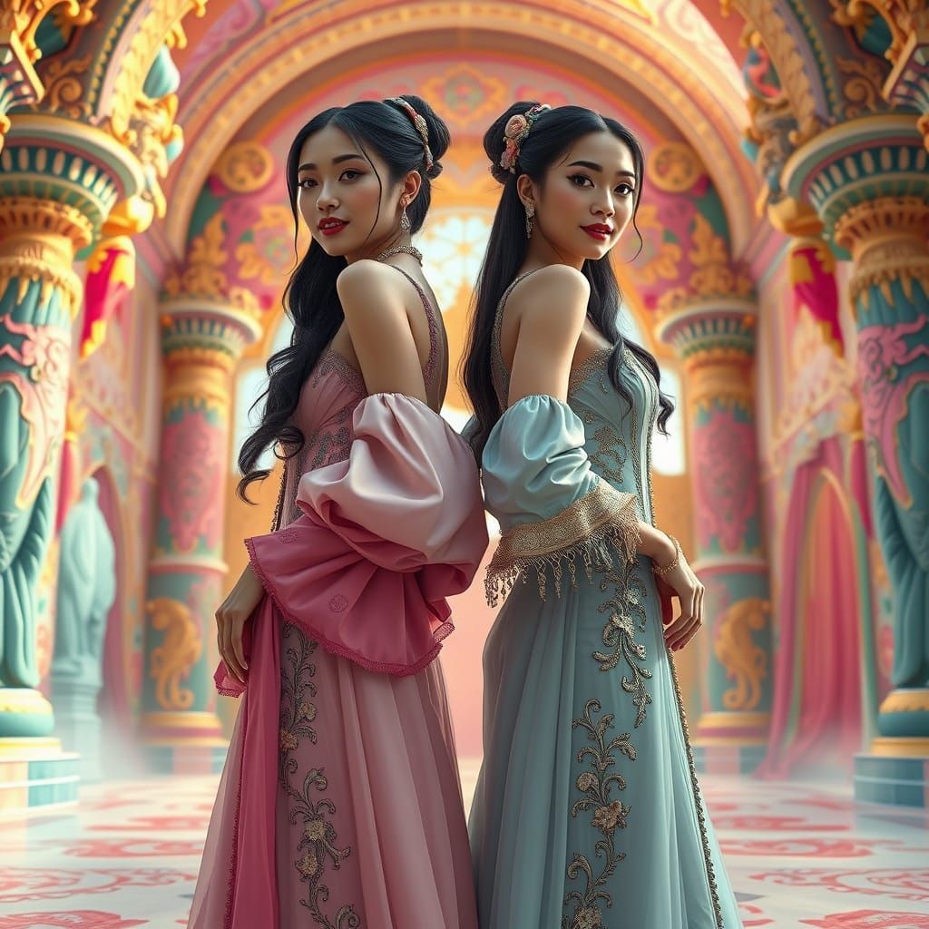 A vibrant image of two women in elegant attire standing back to back. The fantastical environment features intricate architectural details and complementary colors, as digital concept art.