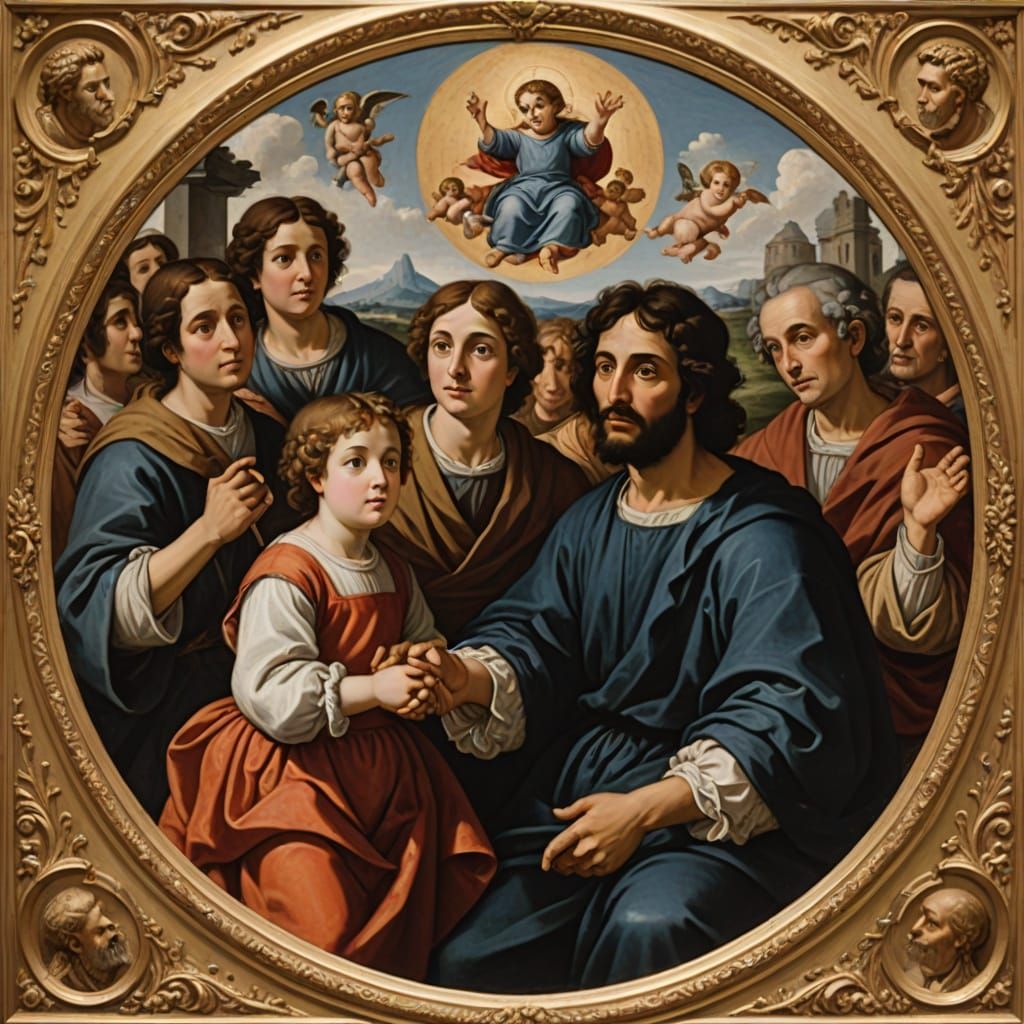 This image shows life depicted in a classical painting style. The artwork uses soft lighting and idealized forms reminiscent of the Italian Baroque period.