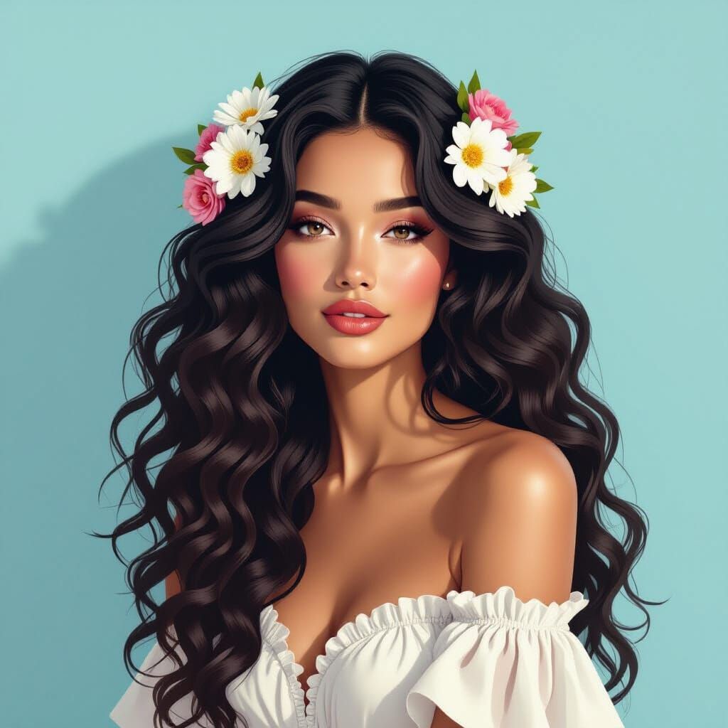 A surreal image of a woman with long curly hair and flowers, set against a soft blue and white backdrop. This artwork captures a dreamy, whimsical aesthetic with bold colors and ethereal lighting.