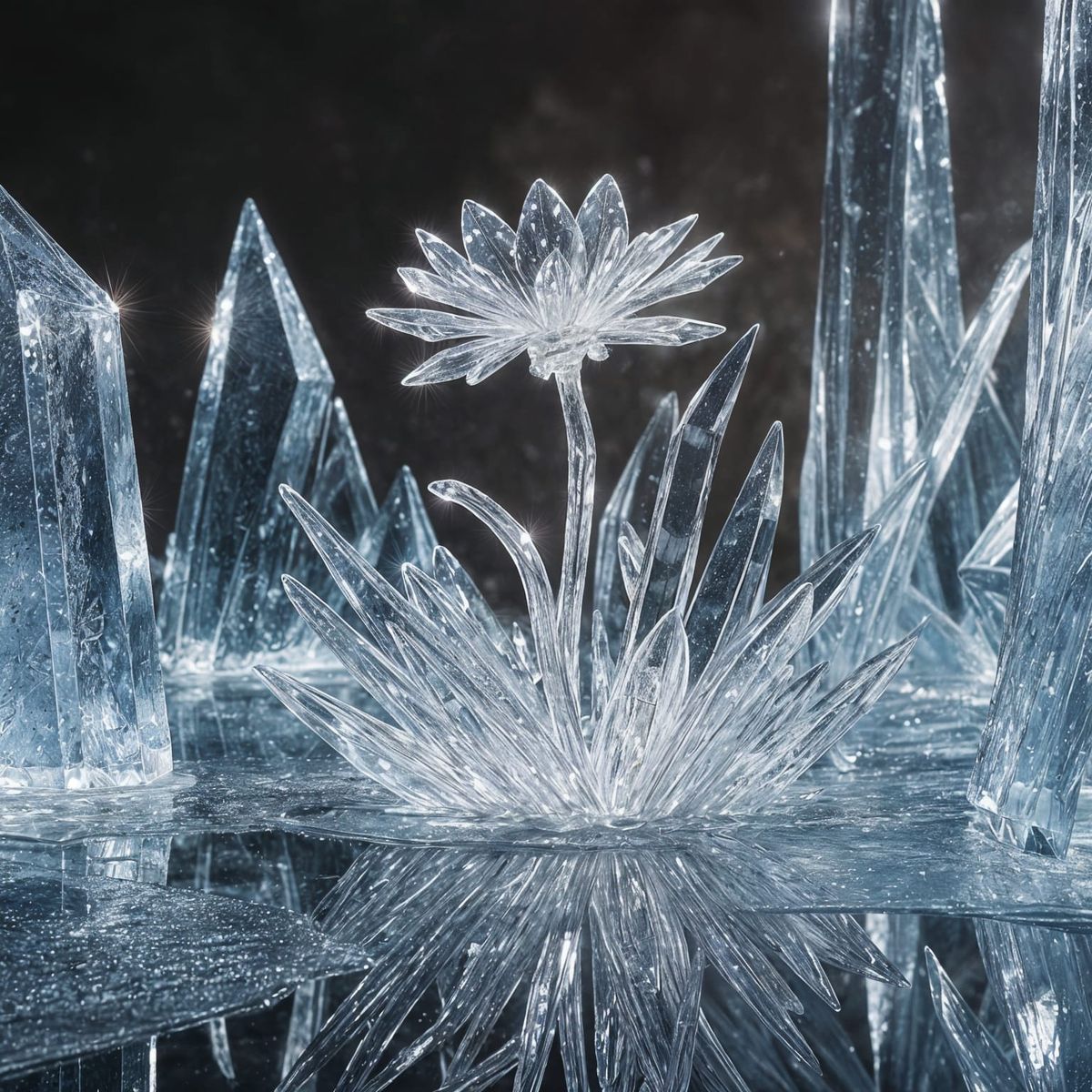 This image depicts a magical crystal garden with delicate ice flowers blooming on a frozen surface. The air crackles with cold energy, and a single ice flower reflects winter light.