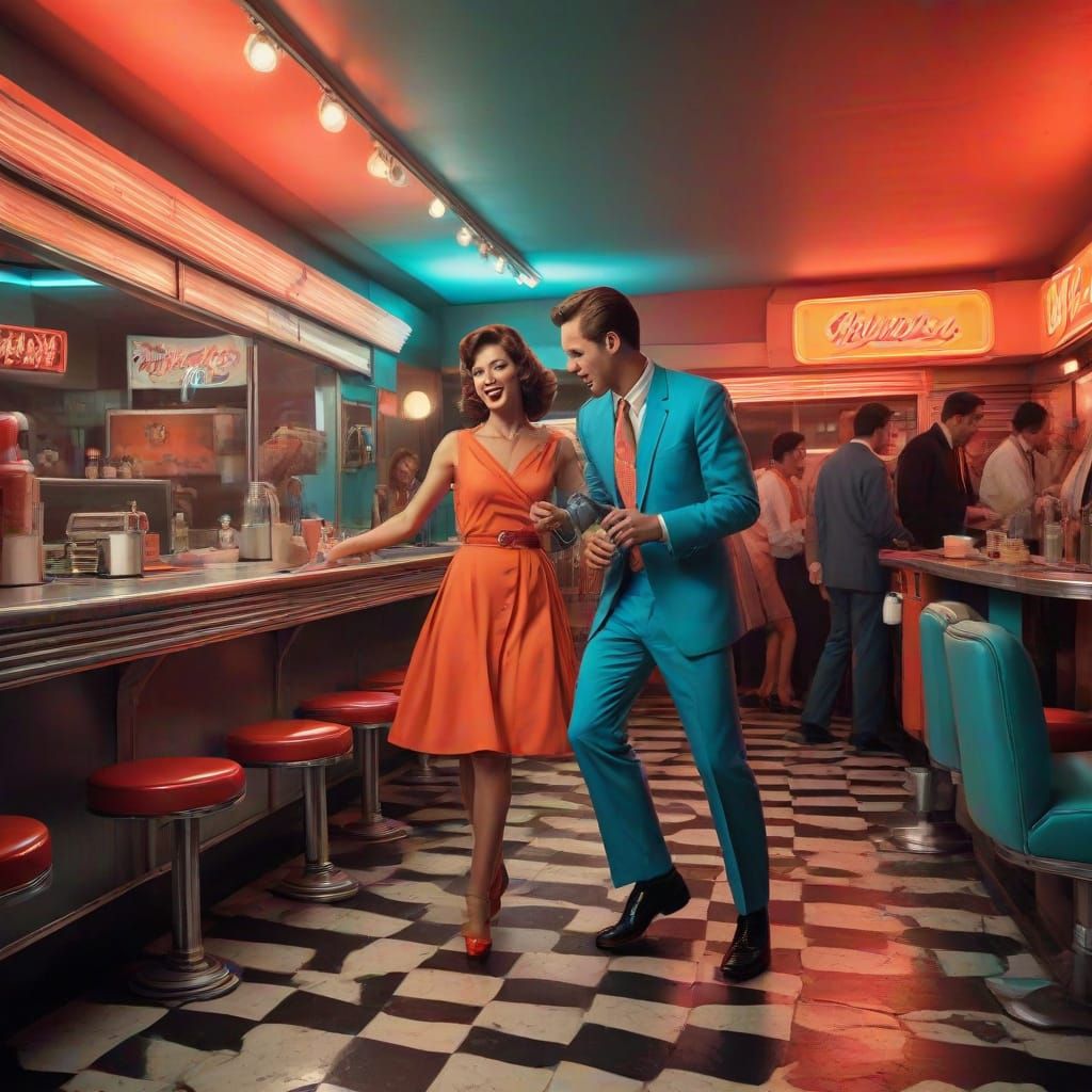 This image captures the energy of a 1960s American diner scene, where people dance 'The Twist' in vibrant colors and dramatic lighting, amidst intricately detailed textures and high contrast.