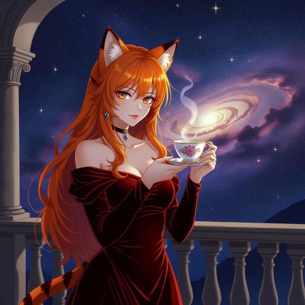This image depicts a woman with distinctive tiger features and a velvet dress, holding a celestial teacup on a balcony overlooking a nebula. Rendered in a matte painting style with soft lighting and deep colors.