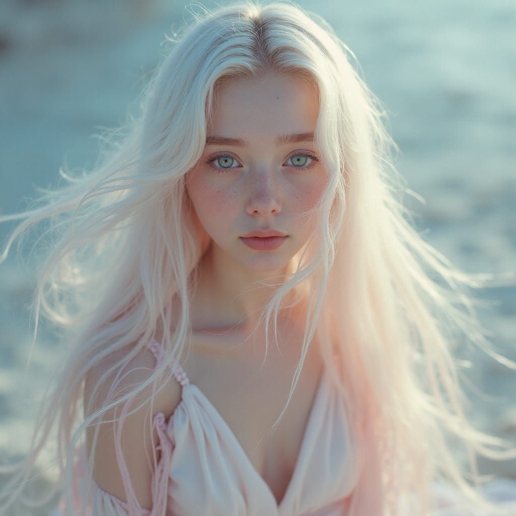 A dreamy, ethereal portrait of a young woman with long pastel hair and serene eyes. She wears minimal white garments, embodying a mythological spirit of purity in soft, cinematic light.