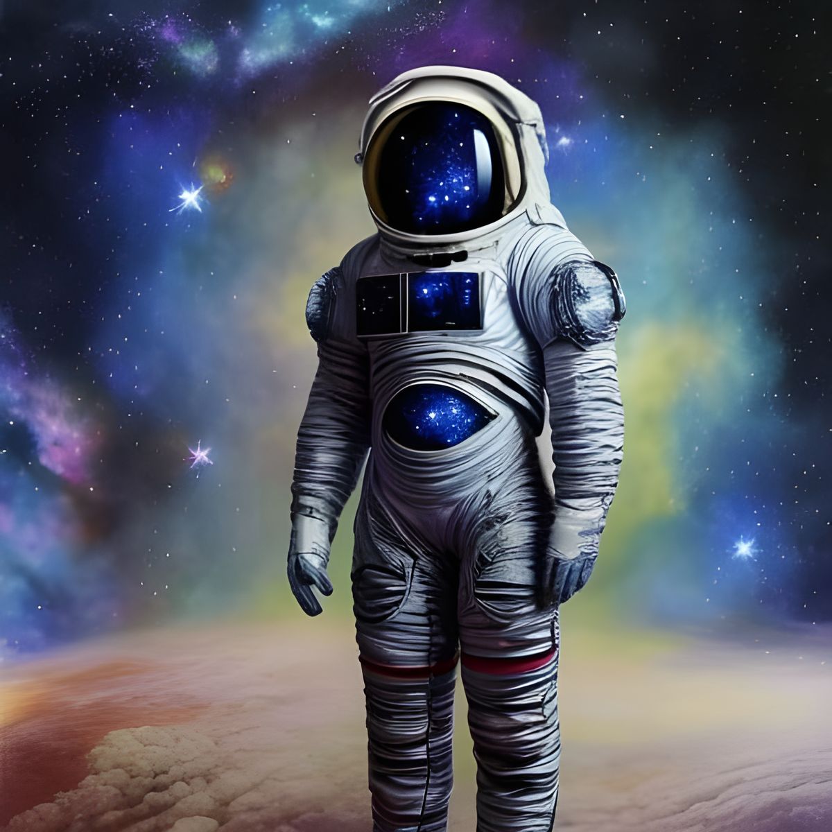 This image shows an astronaut wearing a suit of armor composed of stars and galaxies. The hyperdetailed artwork is rendered with deep colors in a surreal and ethereal style.