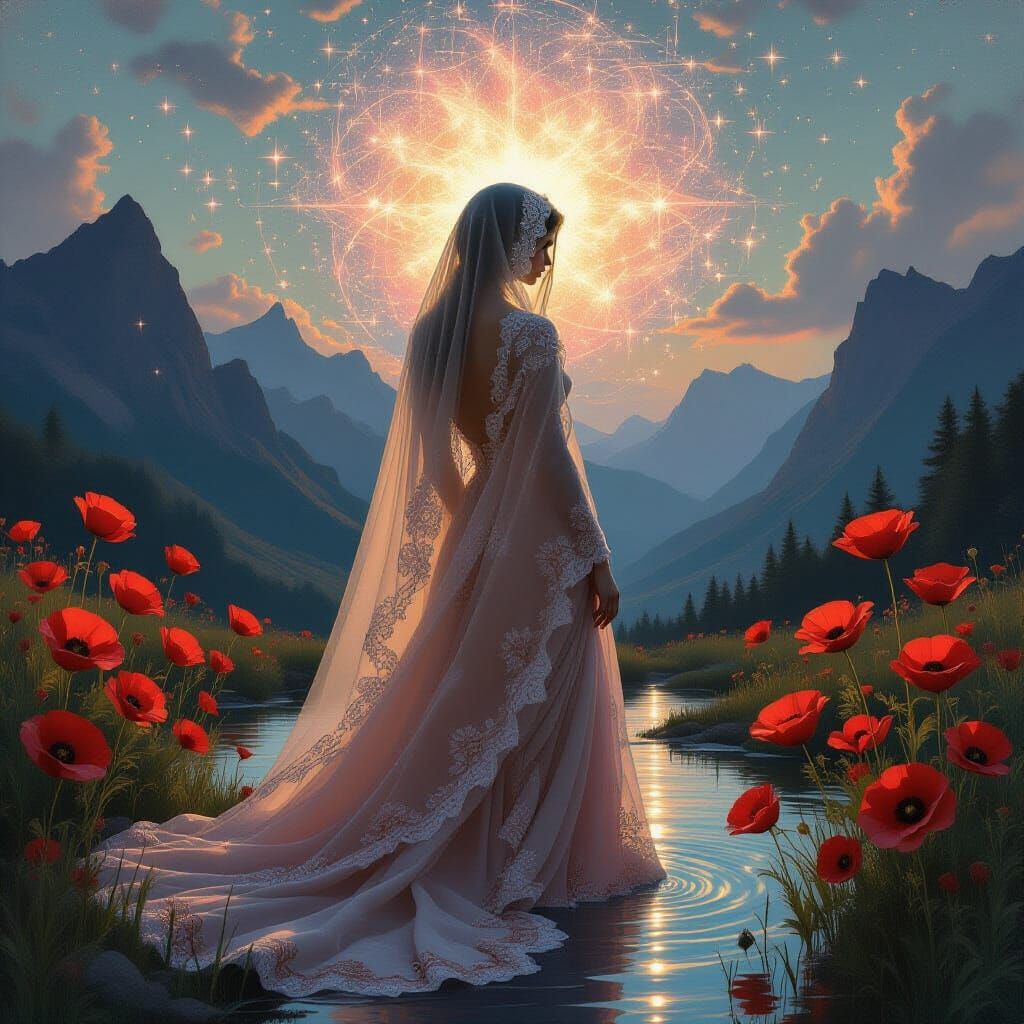 A tonalist oil painting of a veiled figure in rose lace, lit by a supernova. Platinum hair flows into sapphire water with ghostly poppies, set against mountains and constellations.