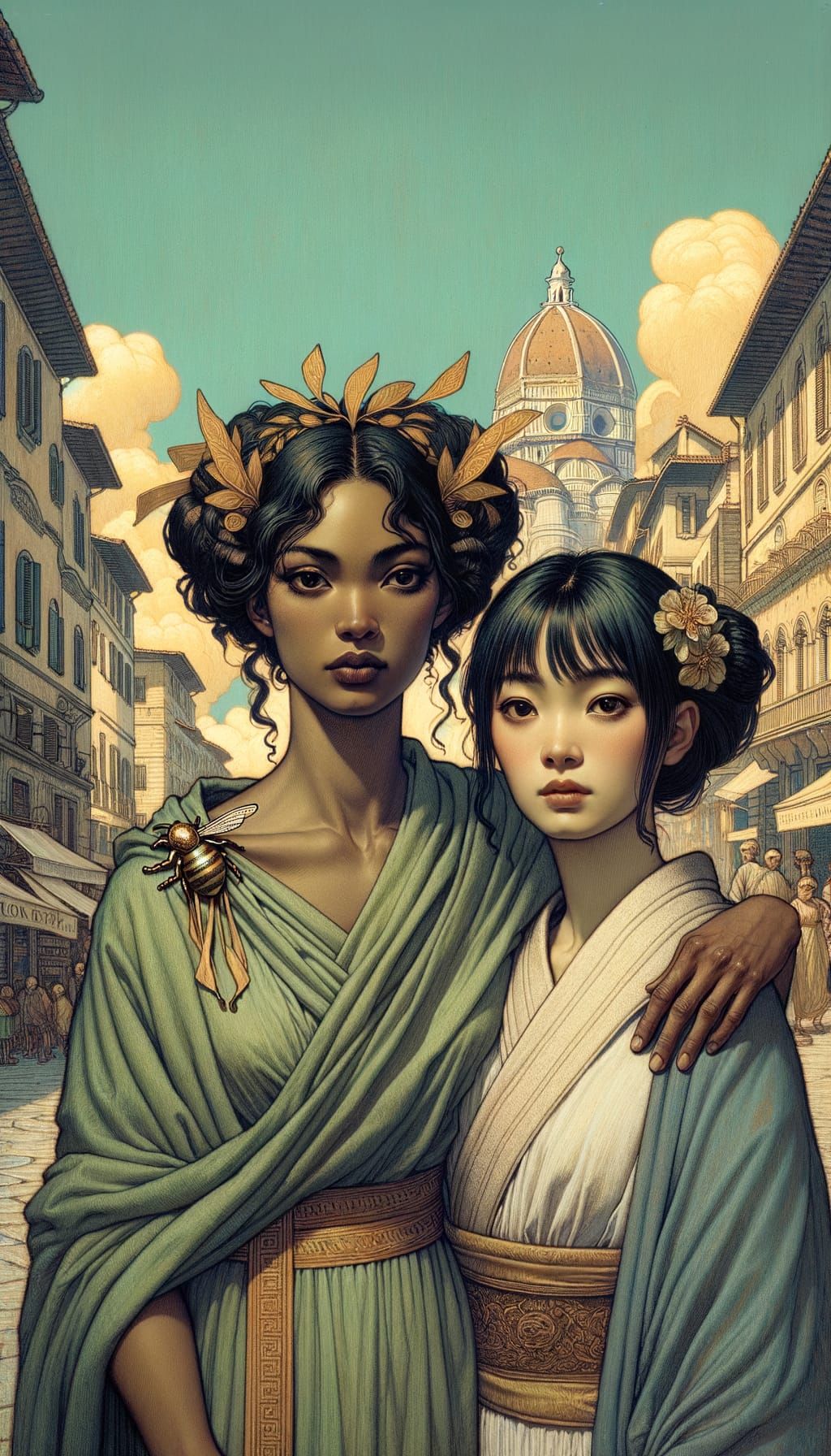 This image shows two women in classical Greek attire strolling along a bustling 19th-century Florentine street. Rendered with intricate details and muted earthy colors, the scene evokes a pre-1912 illustrative style.