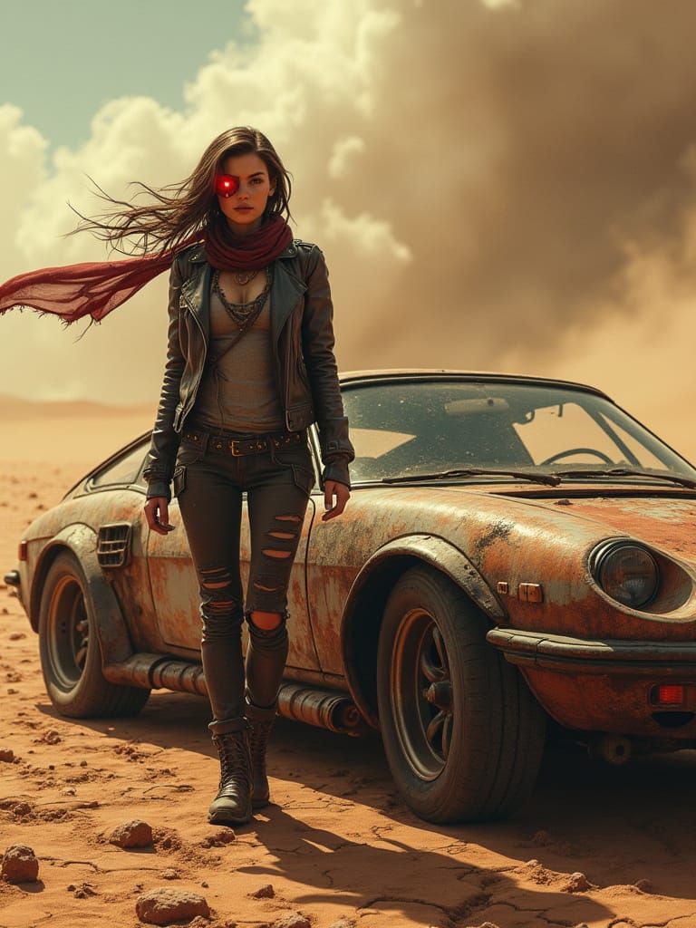 A gritty image of a female driver standing beside a battle-scarred Lamborghini in a desert wasteland, with a cybernetic eye and a determined expression, inspired by Mad Max and Syd Mead's industrial futurism.