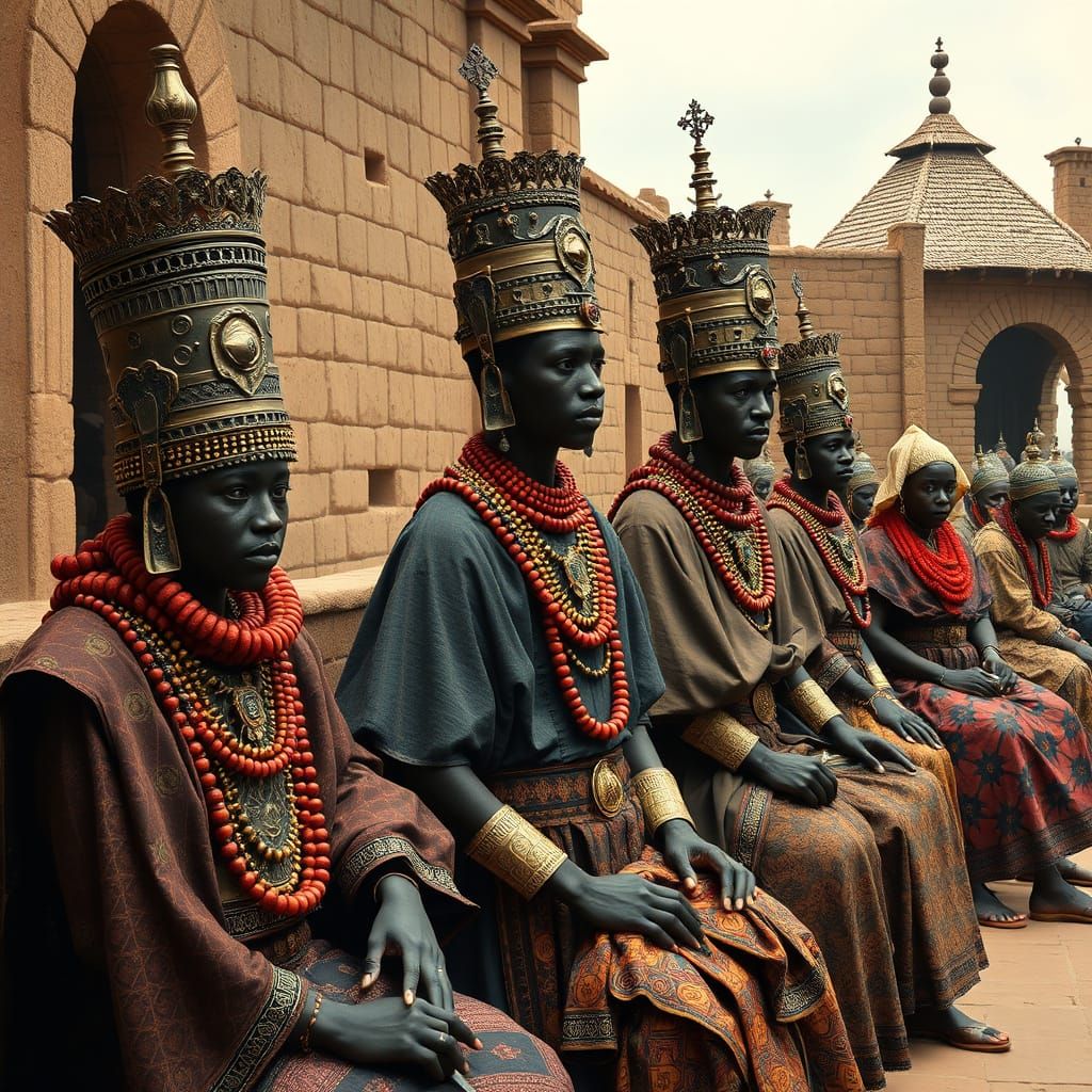 This image depicts the royal court of Benin City in the 15th century. The nobles are adorned in patterned textiles and bronze regalia, in a style reminiscent of early 20th century art nouveau.