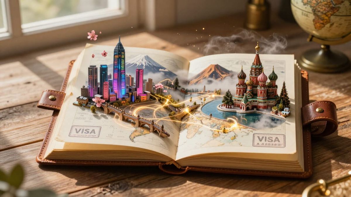 This photorealistic image shows an open antique passport on a wooden table. Intricate 3D cityscapes and landscapes emerge from the pages, connected by magical golden energy.