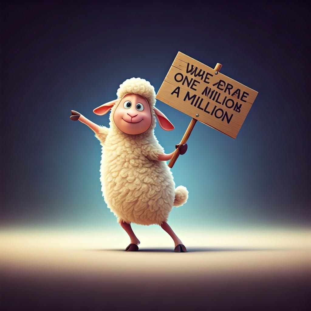 This image shows an anthropomorphic sheep dancing and holding a sign. Rendered as 3D digital art with bright colors and cinematic lighting, it has a Pixar or Disney-esque style.