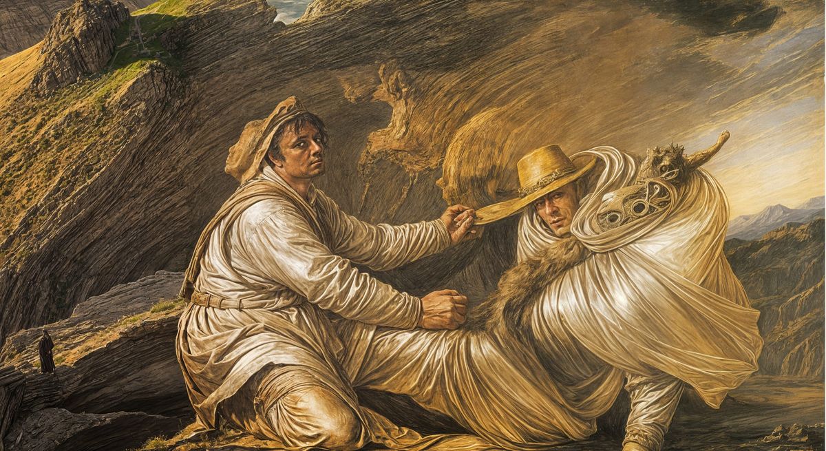 This image shows a giant striding across a landscape, inspired by Romantic-era painting. The artwork features dramatic lighting and emphasizes the chaos and movement of fleeing figures.