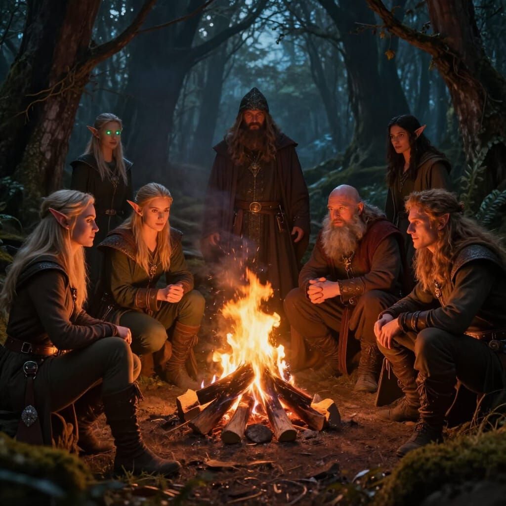 This image depicts a group of diverse fantasy characters, including elves, a dwarf, and a wizard, gathered around a bonfire in a magical forest. Rendered in a detailed concept art style with atmospheric lighting.