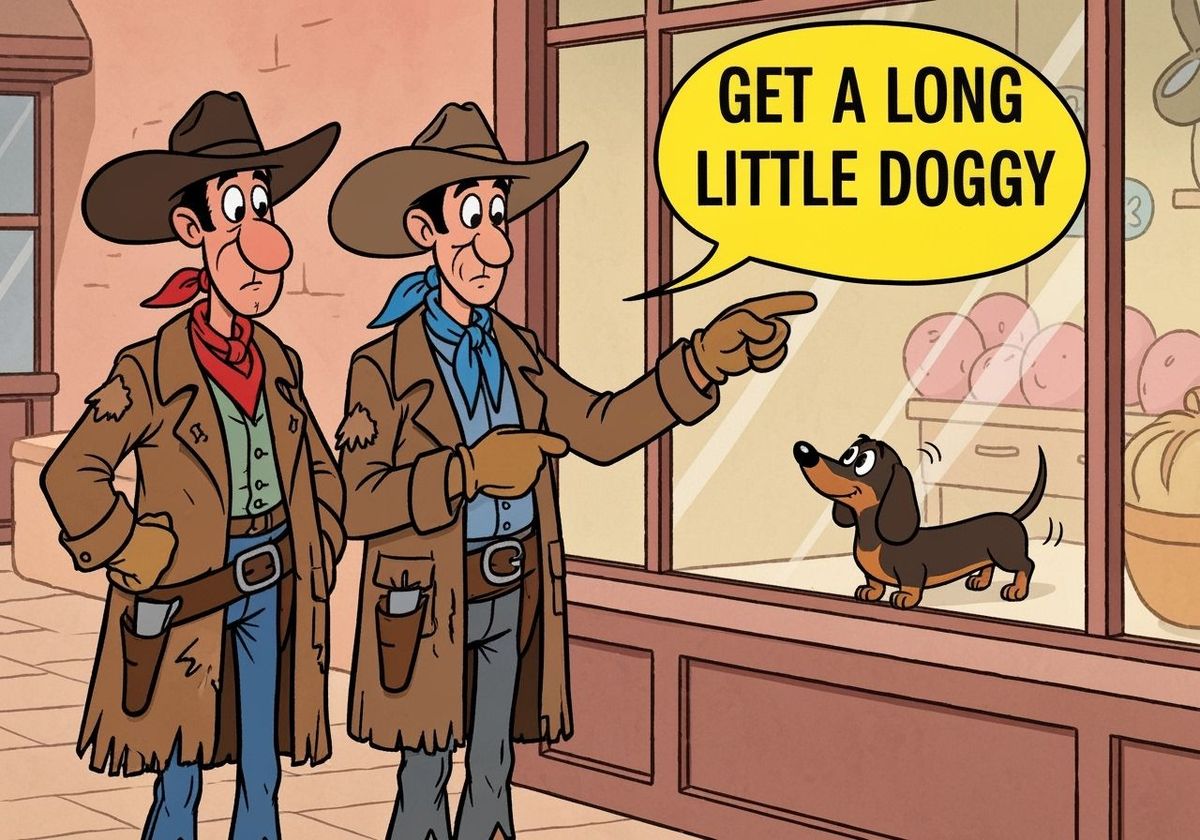 A cartoon image of two cowboys outside a pet shop. One points to a dachshund inside while saying "GET A LONG LITTLE DOGGY" in the style of classic animation.