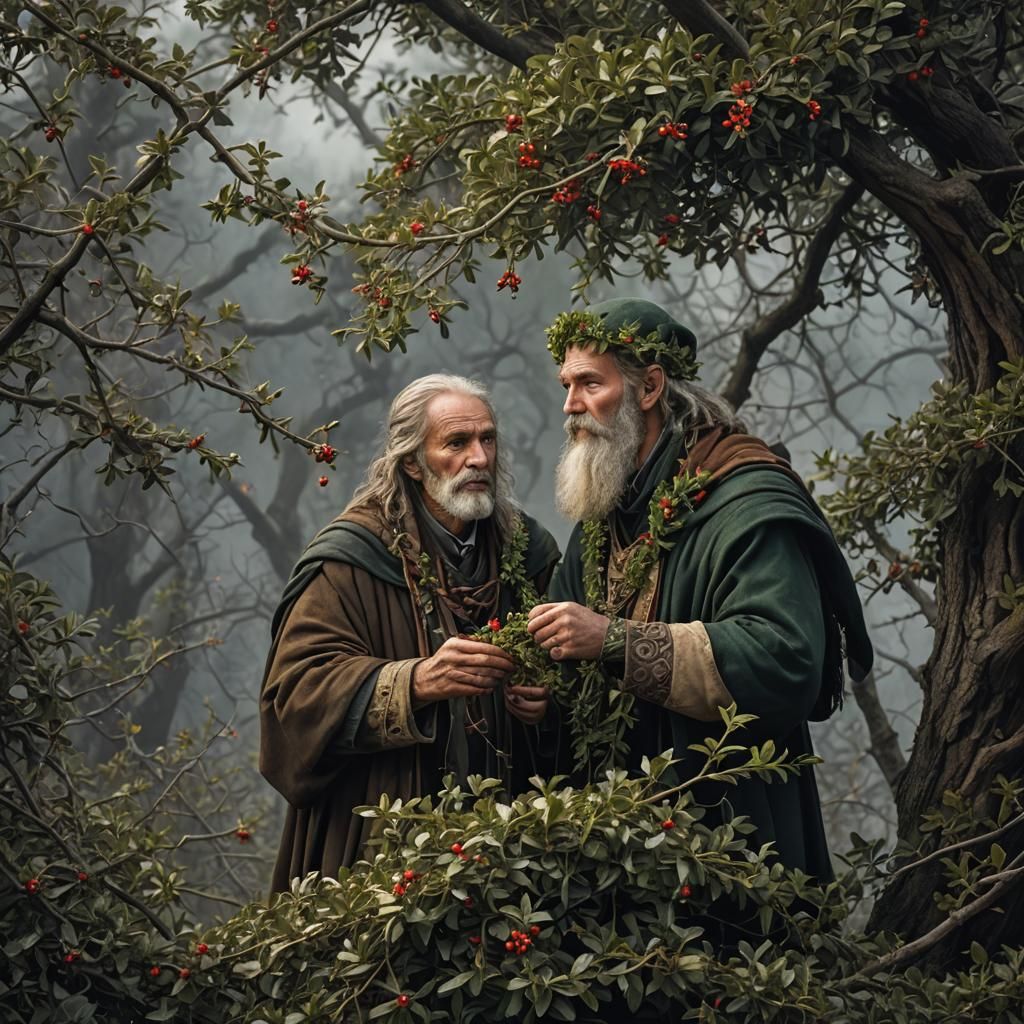 This image depicts a druid collecting mistletoe. The hyperrealistic, deeply colored photograph captures intricate details with sharp focus, high contrast, and a cinematic, atmospheric mood.