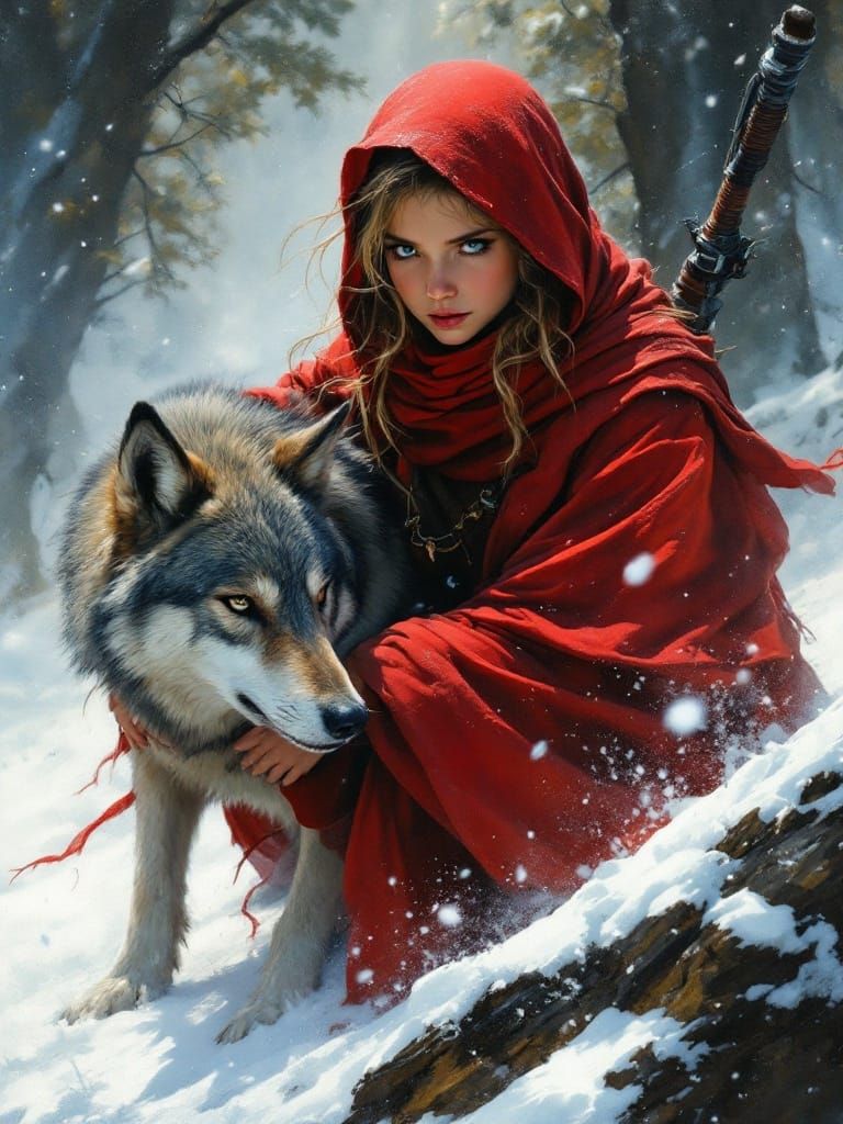 This stunning image reimagines Little Red Riding Hood as a brave Jedi warrior, accompanied by a loyal wolf companion. Created in the style of a movie poster, this ultra-detailed concept art combines the magic of fantasy with the epic scope of the Star Wars universe.