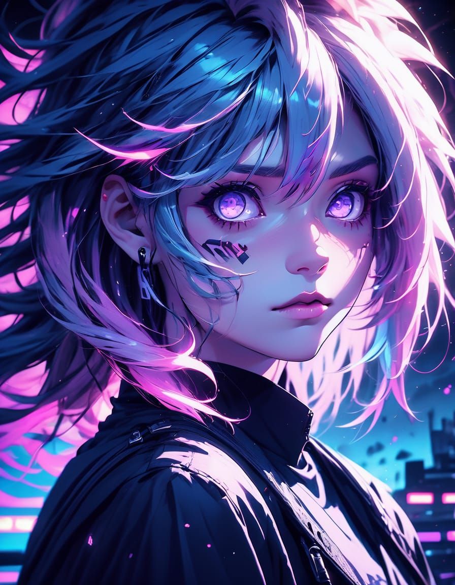 A mesmerizing anime-style portrait of a punk rock music woman, bathed in deep dark light, with long white and pink hair, and piercing blue eyes. Inspired by 80s and 90s anime, with a moody, mystical, and alluring atmosphere.