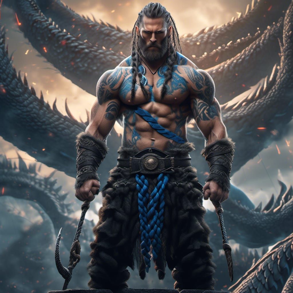 A striking picture of a tall, muscular man with tattoos and braided black-blue Viking hair, set against a dragon backdrop. This dark fantasy artwork features dynamic lighting and intricate details.