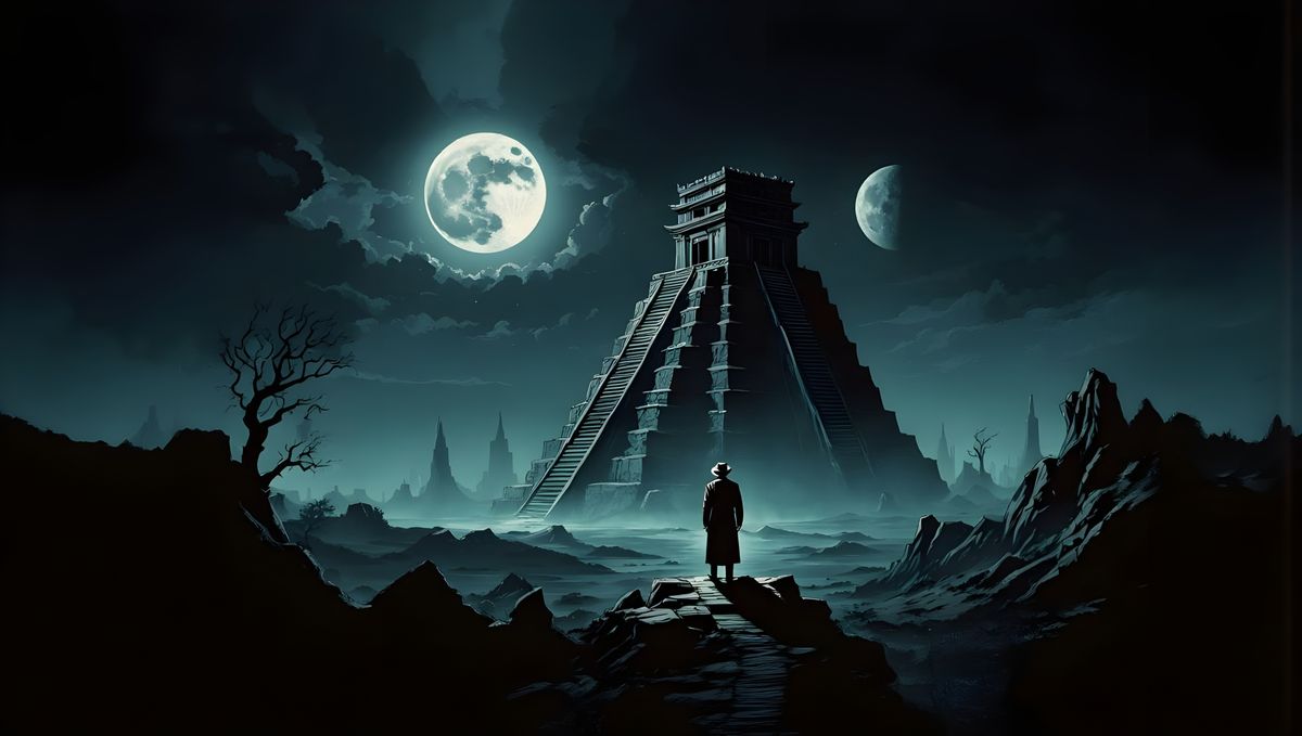 This image shows a paranormal investigator in vintage attire facing an ancient temple with spectral energy under a full moon, evoking a 1950s sci-fi poster aesthetic.