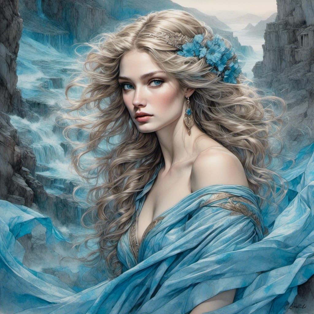 This image shows a detailed matte painting of Helen of Troy. Her sky-blue hair and porcelain skin are rendered in deep color with intricate detail, in a fantastical style.