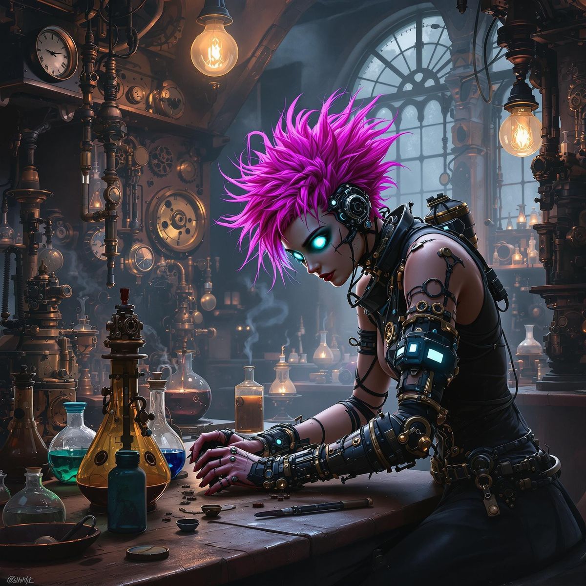 This image shows a dieselpunk alchemist in a hidden laboratory. The alchemist, enhanced with cybernetics, works among bubbling beakers and clockwork. The artwork blends science with arcane arts in a dark fantasy style.