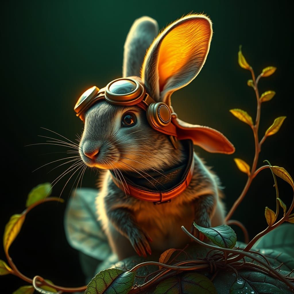 This image features a daring rabbit in a leather aviator helmet, perched on a detailed flying leaf-ship, with soft golden lighting and intricate textures, evoking a sense of adventure and bravery in a mystical, triadic-colored world.