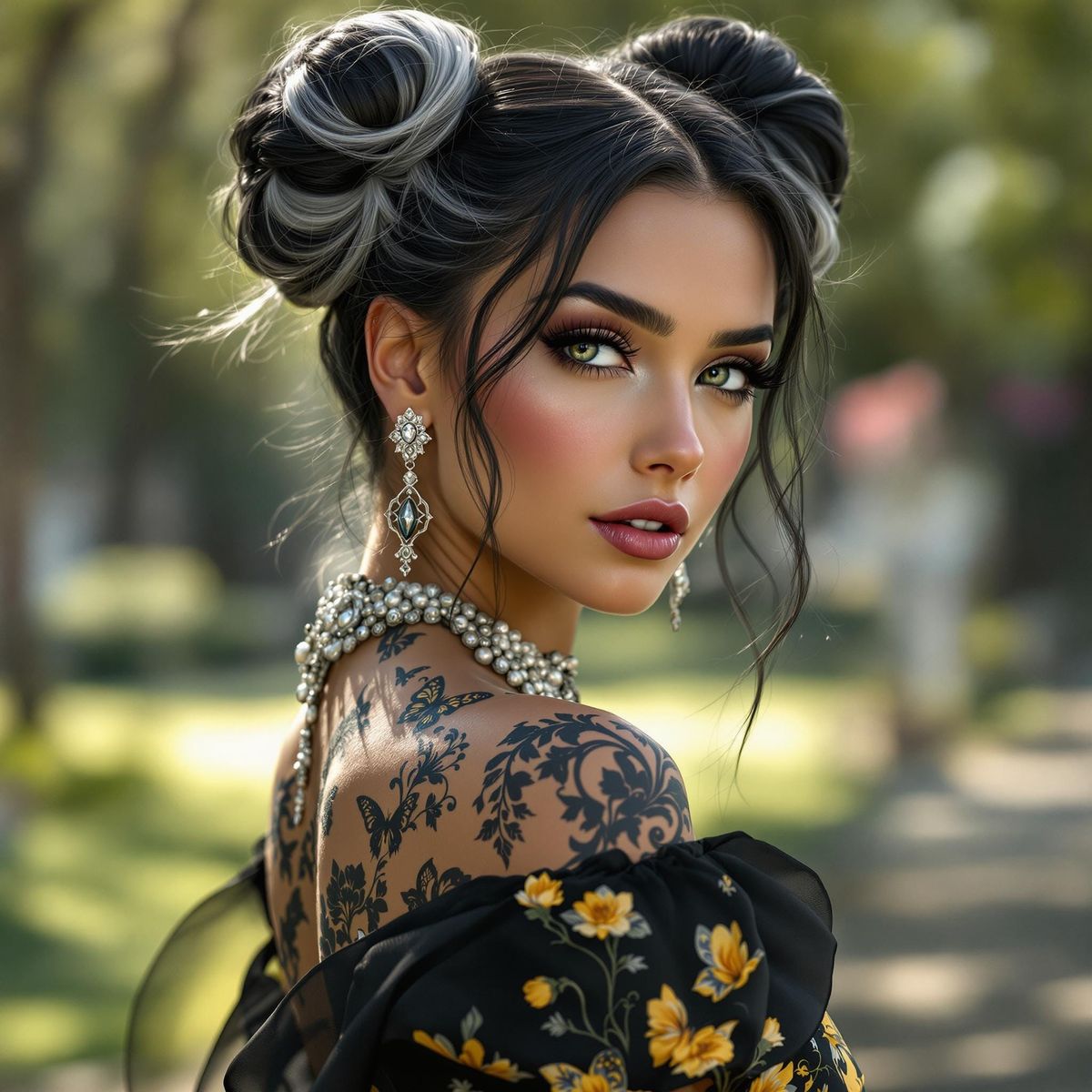 This image features a stunning woman with wavy black and silver hair, piercing green eyes, and intricate silver jewelry, set against a sunlit day backdrop, with a mix of photorealism and subtle mysticism.