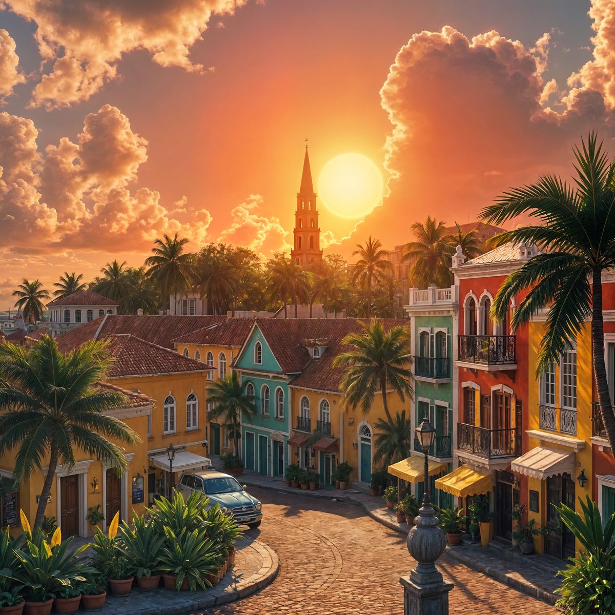 This image shows Oranjestad, the capital of Aruba, at midday. The architecture blends Caribbean and Dutch Colonial styles, with colorful buildings, Divi Divi trees, and other tropical plants. As a maximalist digital painting.
