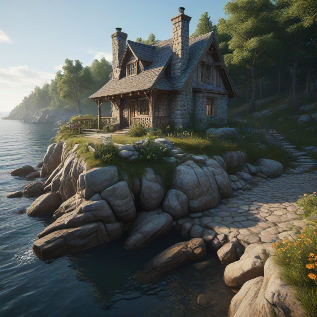 This detailed matte painting captures a fantastical stone and wood cottage on a promontory at dawn. The scene features the open sea and a wooded prairie, rendered with vivid colors and natural sunlight in a joyful mood.