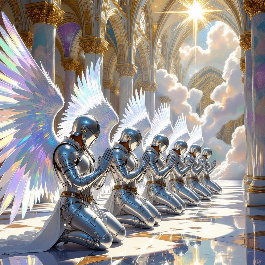A majestic scene depicts silver angels kneeling in prayer inside a crystal cathedral. The image evokes Renaissance paintings, with a cosmic surrealism aesthetic, and stardust swirling in the air.