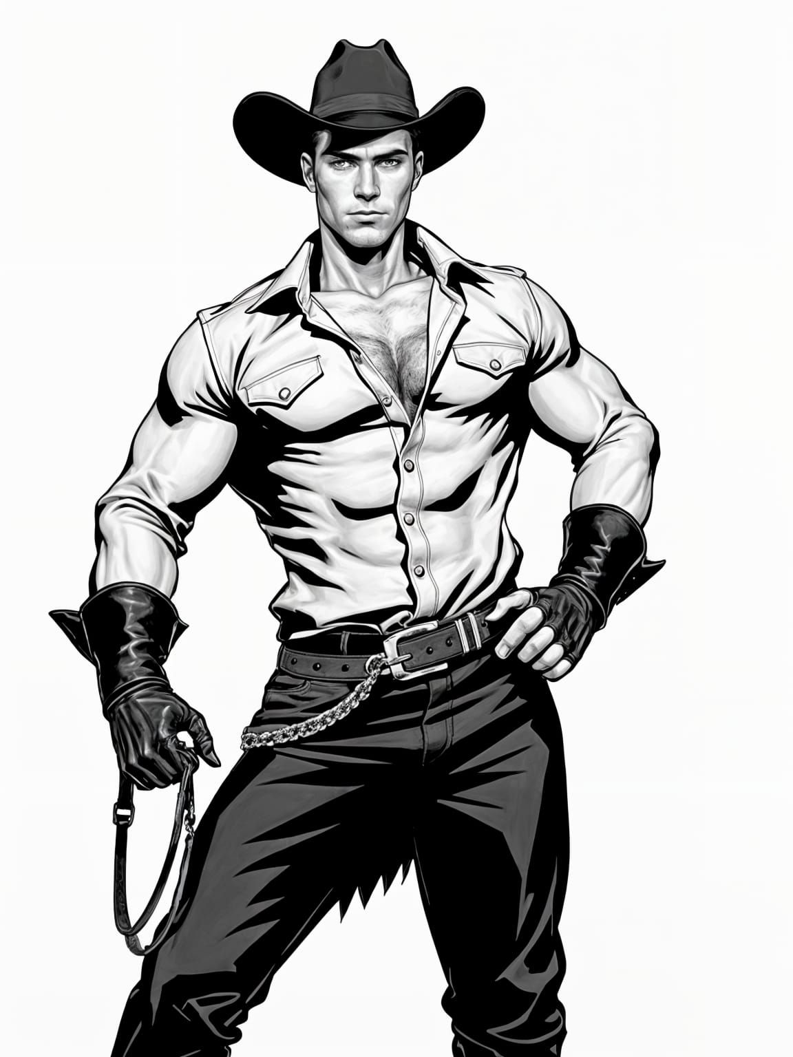 This image shows a muscular cowboy in a vintage black and white illustration. The figure, with a chiseled jawline and piercing eyes, is confidently posed in classic pinup style.