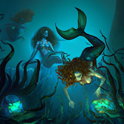 A dark and sinister image of zombie mermaids underwater. The horror scene features complex details and dynamic lighting, reminiscent of gothic art.