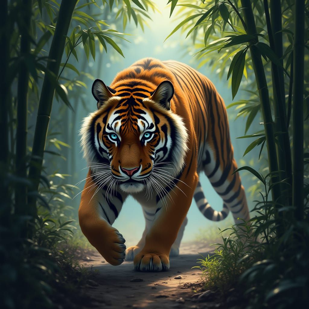 This image shows a stunning Bengal tiger with piercing blue eyes, set against a vibrant bamboo forest backdrop. The tiger's striped fur glistens in the sunlight, captured in meticulous detail with a hyperrealistic style reminiscent of wildlife art masters.