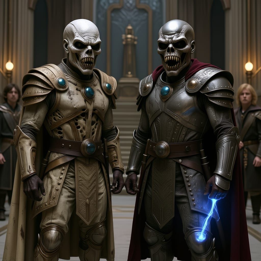 This image depicts realistic portrayals of Lieutenant Dan and Forrest Gump adorned in ornate Asgardian jewel and gold encrusted armor, resembling a scene from a futuristic Jedi academy.