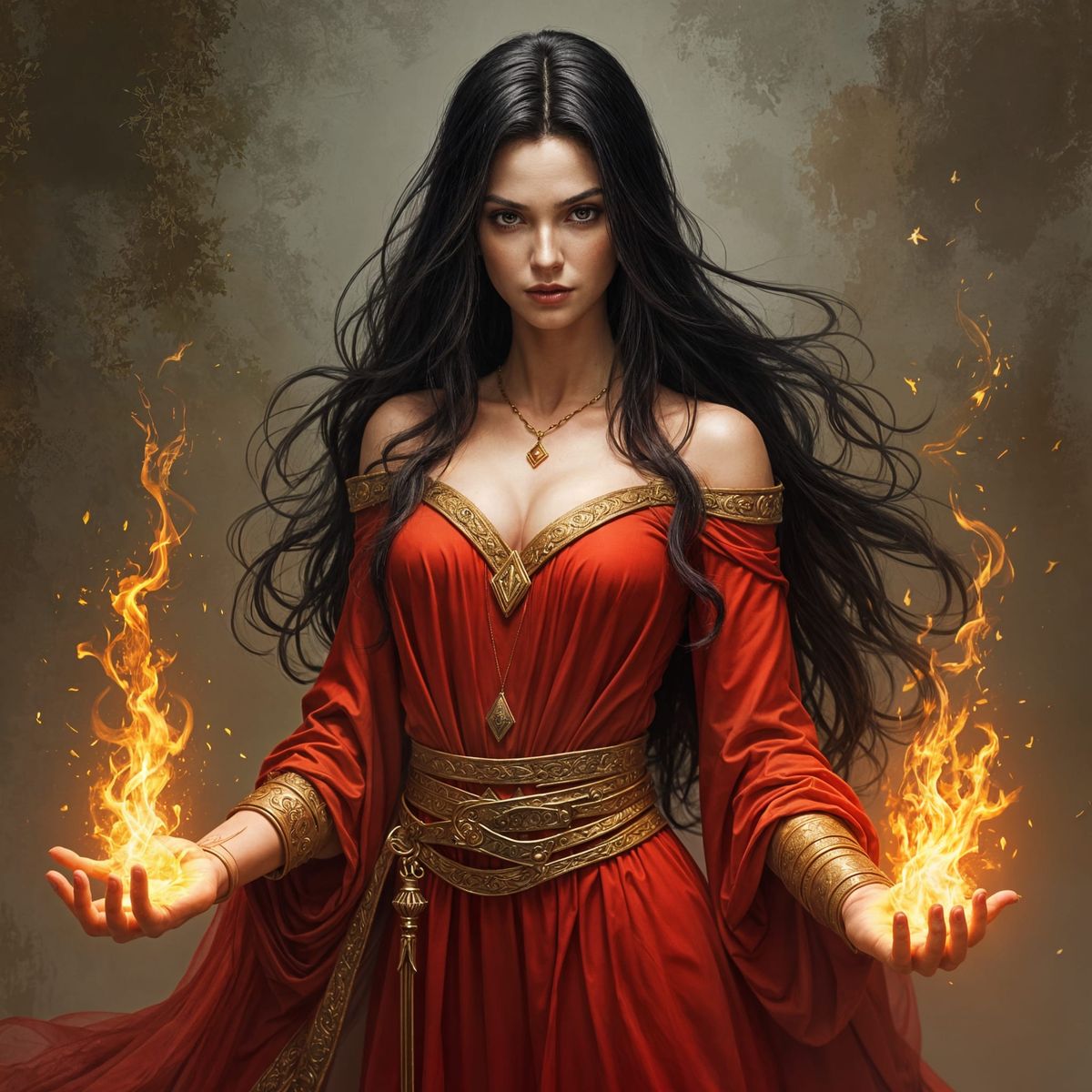A striking picture of a beautiful female sorcerer with dark hair and fierce eyes. The portrait, reminiscent of classical painting, shows subtle fire magic around her hands, portraying her as a valiant adventurer.
