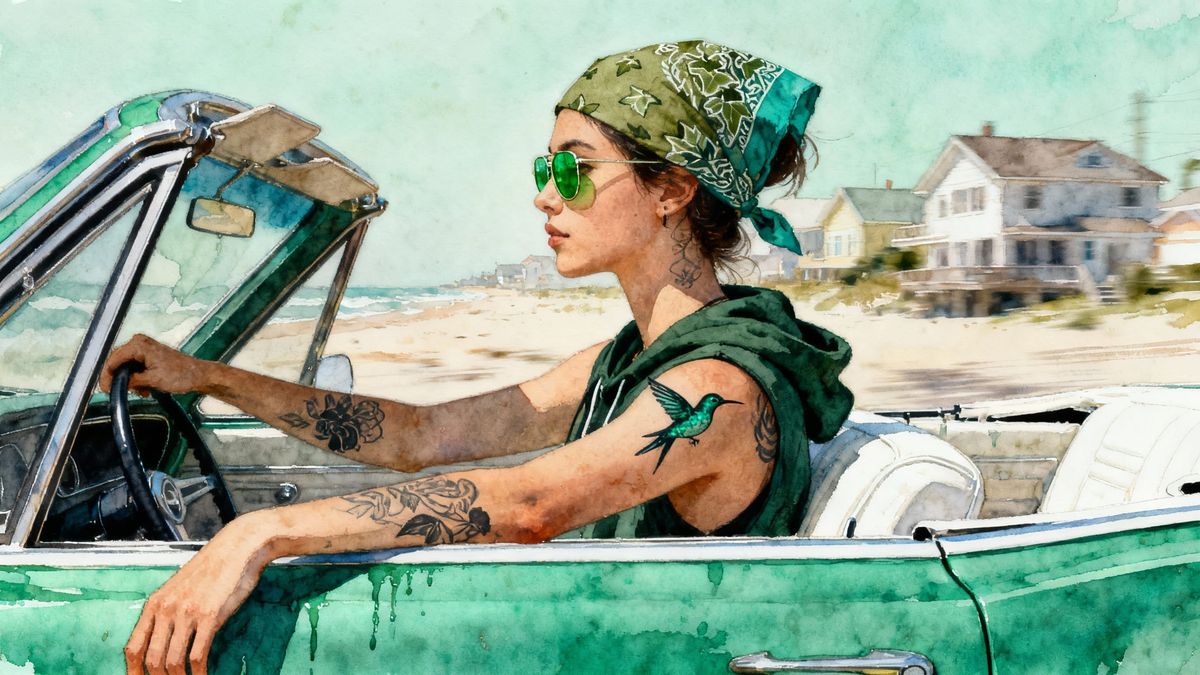 A John Blanche style side-profile watercolour of a young woman (5' 8" tall; ivy-pattern olive/teal bandana; dark-green sleeveless hoodie; black/teal hummingbird tattoos; emerald-green lens sunglasses) driving a 1967 Pontiac convertible (sea-green paint with white trim). Her left arm hangs out the car ...